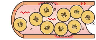 血糖値の上昇により血液の濃度が高い状態が慢性的に続くと、血管の内壁が傷つき、詰まるなどして血流が滞ります。その結果、全身の血管を中心にさまざまな臓器の機能を失ってしまいます。合併症の多くは数年から数十年単位で進行し、進行するまで自覚症状がでないことが多いため注意が必要です。