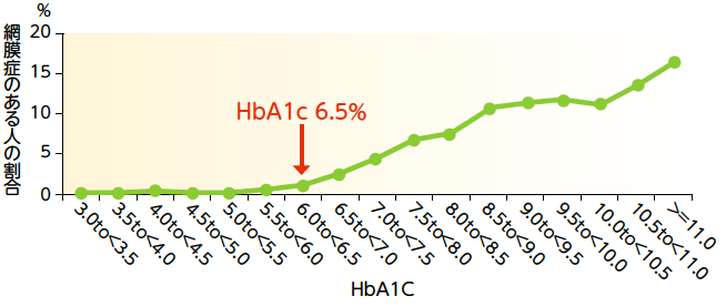 糖尿病により目の奥にある網膜を通る細い血管が傷つき、進行していくと眼底出血や網膜剝離(はくり)により失明することもあり、実際に成人になってからの失明原因の第3位は糖尿病です。また、血糖値の検査値HbA1c(へもぐろびんえーわんしー)が6.5%を過ぎると網膜症を発症しやすくなります。[1][2]