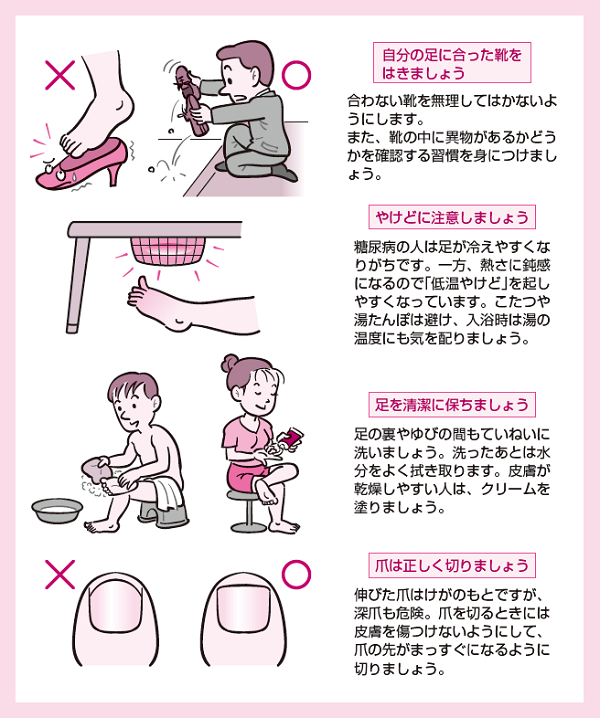 神経障害がすすむと足の感覚がマヒしてしまい、やけどや外傷の痛みに気づかない場合があります。気づかぬうちに足の手当てが遅れてケガから潰瘍や壊疽(えそ:皮膚の組織が壊れて腐敗すること)が進行すると足の切断を余儀なくされ、歩行困難な状態に陥る危険があるためしっかり予防しましょう。
